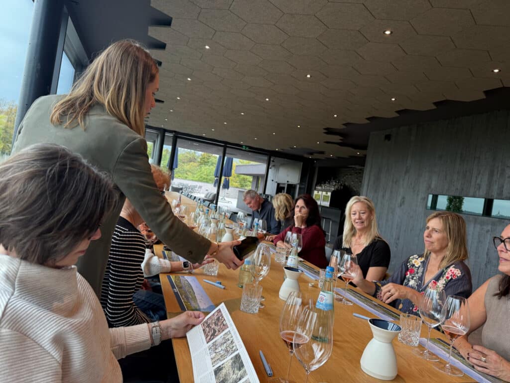 Next the group visited Weingut Bergdolt-Reif & Nett (sold under the brand name Nett) an award-winning, family-run wine estate in Duttweiler, Pfalz, Germany dating back to 1838. They learned about the future forward approach that wine maker Christian Nett brings to his work, combining the vineyard’s oldest traditions with a willingness to experiment with new ideas, including a broad range of premium dealcoholized wines. The group enjoyed a lovely spread of German meats and cheeses with the tasting.